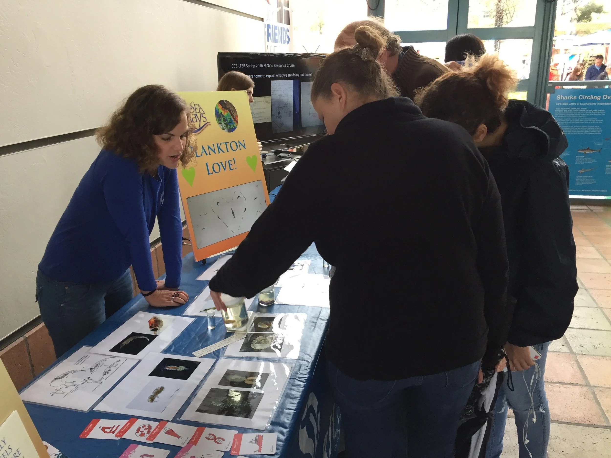 During my Price Postdoctoral Fellowship, I gained formal teaching experience. I co-taught a course called COSIA, or Communicating Ocean Science to Informal Audiences. We taught both undergraduate and graduate Scripps and UCSD students. We taught the students communication and teaching skills, and let the students build an interactive activity on the floor of the Aquarium. We then let them redesign the activity throughout the quarter, as they learned more about what resonates with informal audiences. Below is a picture of me teaching the public on the floor of the aquarium, exactly as I had the students do.